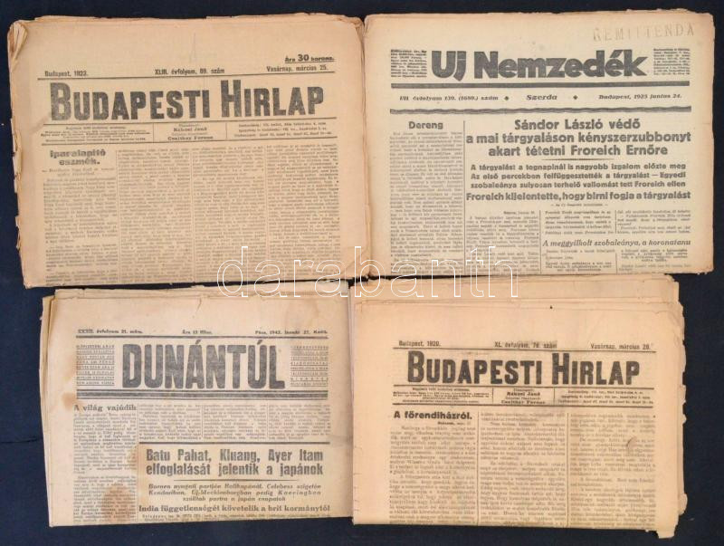 Leírás: 1920-1922 A Budapesti Hírlap 5 száma + A Dunántúl c. újság 2 száma + az Új Nemzedék c. újság egy száma.