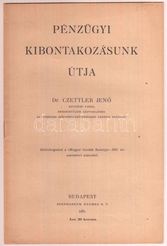 1921 Bp., Dr. Czettler Jenő: Pénzügyi kibontakozásunk útja, kivonat a ... https://www.darabanth.com/hu/285-Gyorsarveres/285.0/Festmeny-mutargy-papirregiseg-egyeb/Nyomtatvanyok~100027/1921-Bp-Dr-Czettler-Jeno-Penzugyi-kibontakozasunk-utja-kivonat-a-Magyar-Gazdak-Szemleje~II1490985