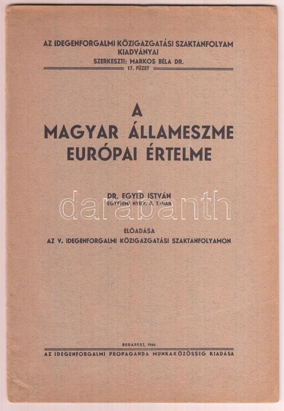 1944 Bp., Dr. Egyed István: A magyar állameszme európai értelme, az Id... https://www.darabanth.com/hu/285-Gyorsarveres/285.0/Festmeny-mutargy-papirregiseg-egyeb/Nyomtatvanyok~100027/1944-Bp-Dr-Egyed-Istvan-A-magyar-allameszme-europai-ertelme-az-Idegenforgalmi-Kozigazgata~II1491192
