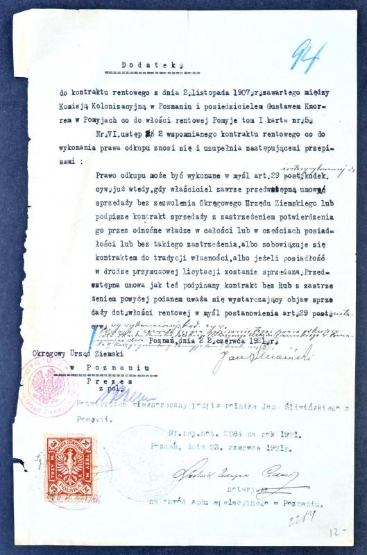 Leírás: 1921 Poznanban kiállított lengyel okmány 3M okmánybélyeggel