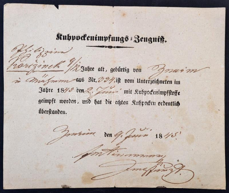 1845 Tehénhímlő oltási bizonyítvány https://www.darabanth.com/hu/285-Gyorsarveres/285.0/Festmeny-mutargy-papirregiseg-egyeb/Okmanyok~100016/1845-Tehenhimlo-oltasi-bizonyitvany~II1486009