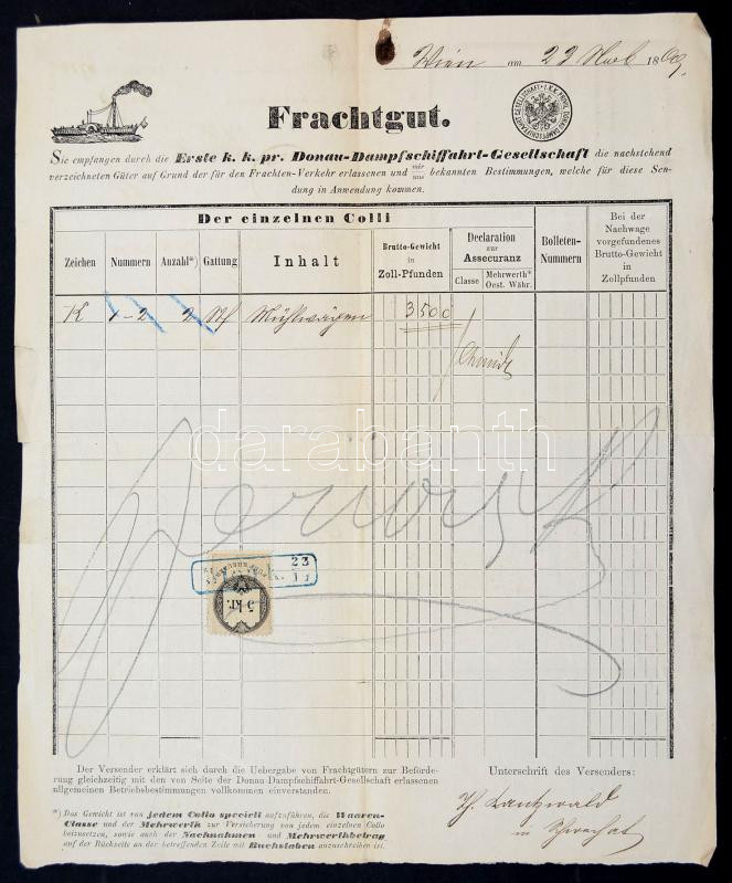 1869 DDSG fuvarlevél / DDSG bill of freight. https://www.darabanth.com/hu/285-Gyorsarveres/285.0/Festmeny-mutargy-papirregiseg-egyeb/Okmanyok~100016/1869-DDSG-fuvarlevel-DDSG-bill-of-freight~II1493901