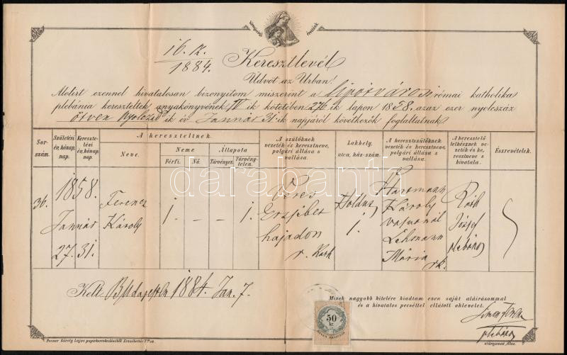 1884 Koldus gyermekének keresztlevele https://www.darabanth.com/hu/285-Gyorsarveres/285.0/Festmeny-mutargy-papirregiseg-egyeb/Okmanyok~100016/1884-Koldus-gyermekenek-keresztlevele~II1494539