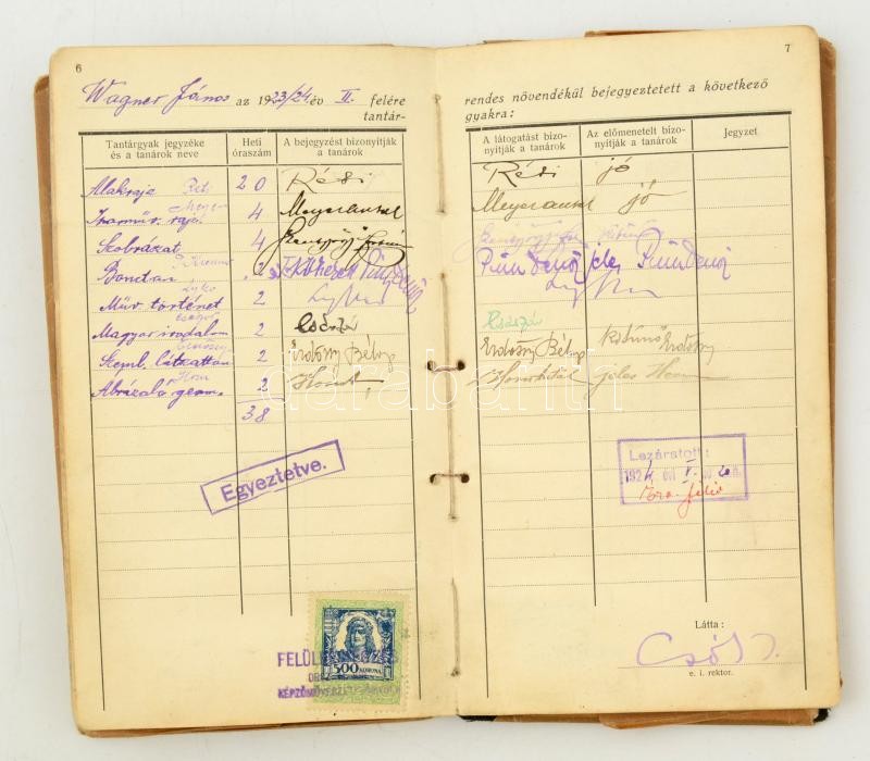 1923-1929 Országos Magyar Királyi KépzÅ‘művészeti FÅ‘iskolai hallgató leckekönyve, számos oktató (Réti István, Megyer-Meyer Antal, Andretti Károly, Bory JenÅ‘, Lyka Károly, Dudits Andor és mások) aláÃrásával.