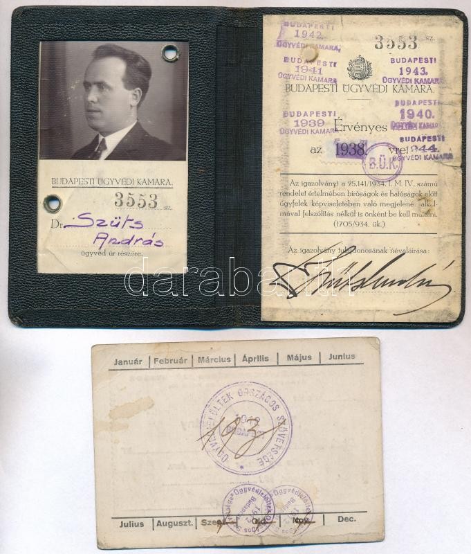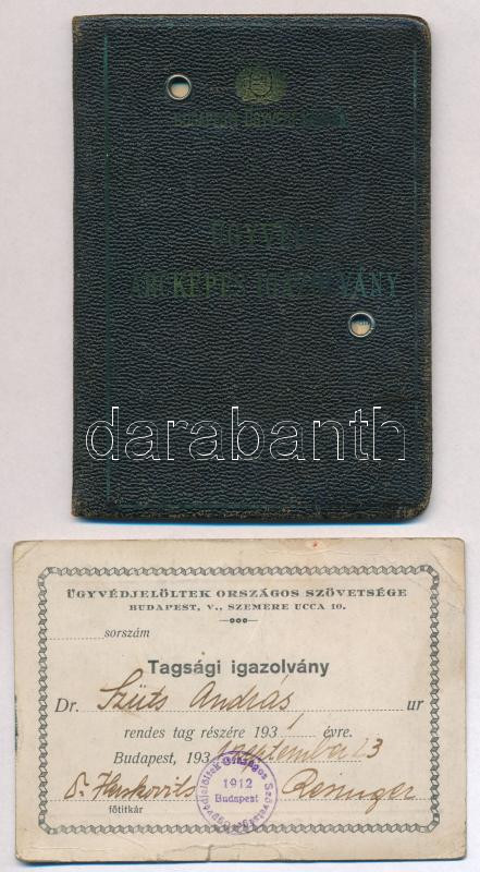Leírás: 1931-1938 Fényképes ügyvédi igazolvány, hosszabbításokkal + Ügyvédjelöltek Országos Szövetsége tagsági igazolvány