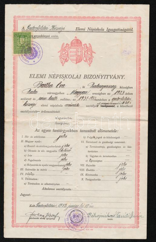 Leírás: 1932 Elemi népiskolai bizonyítvány okmánybélyeggel