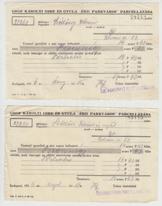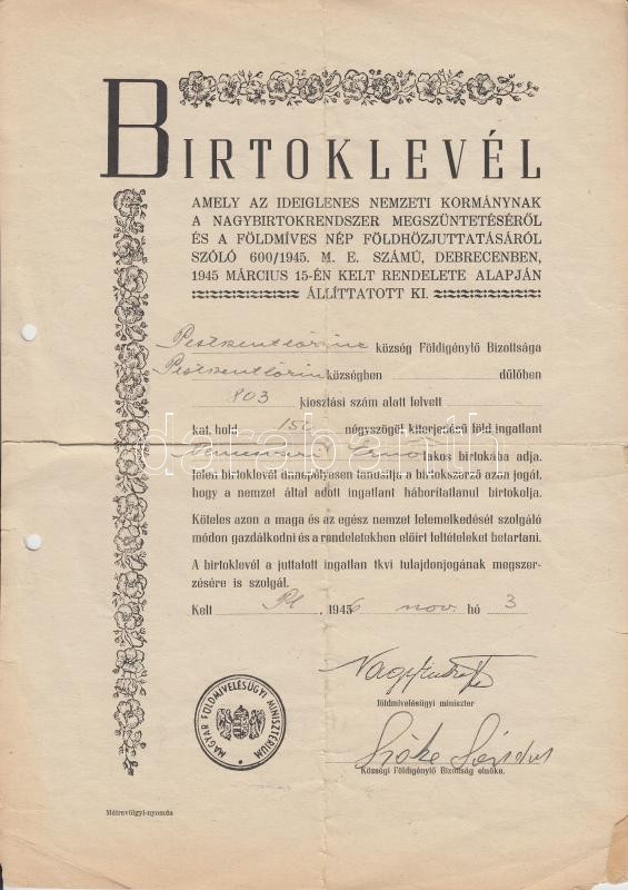 1936, 1946 Az Ideiglenes Nemzeti Kormány nagybirtokrendszer megszüntetéséről szóló rendelete alapján kiadott birtoklevél + Érd parkváros parcellázásával kapcsolatos nyugta, 5 db