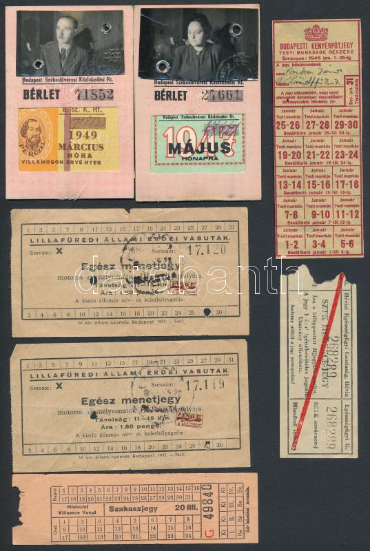 Leírás: 1945-1949 menetjegy (4 db), bérlet (2db), kenyérpótjegy (1db)