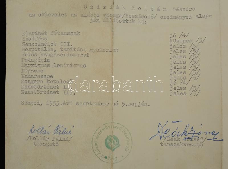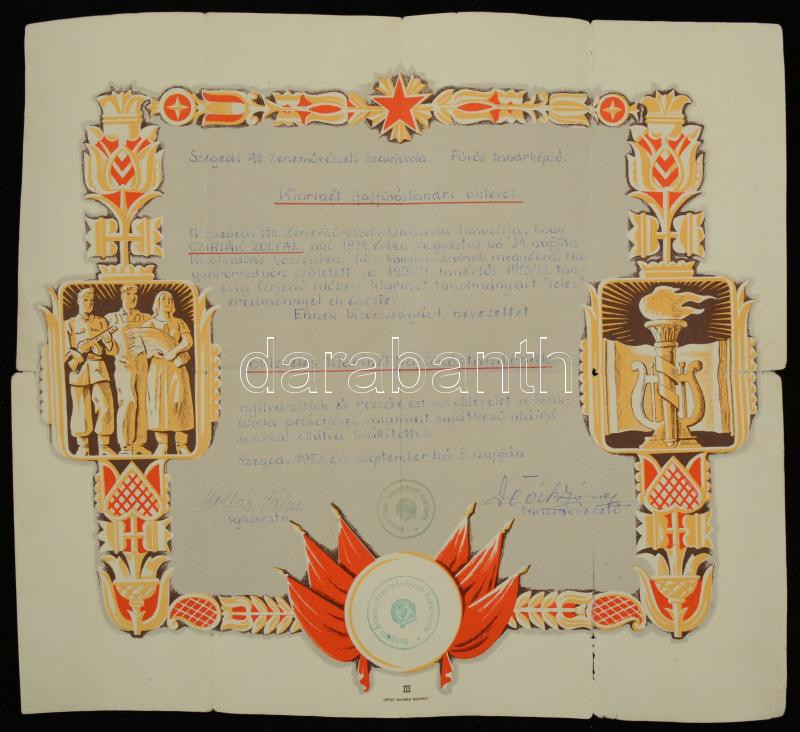1953 a Szegedi Állami Zeneművészeti Szakiskola fúvóstanári oklevele https://www.darabanth.com/hu/285-Gyorsarveres/285.0/Festmeny-mutargy-papirregiseg-egyeb/Okmanyok~100016/1953-a-Szegedi-Allami-Zenemuveszeti-Szakiskola-fuvostanari-oklevele~II1457481