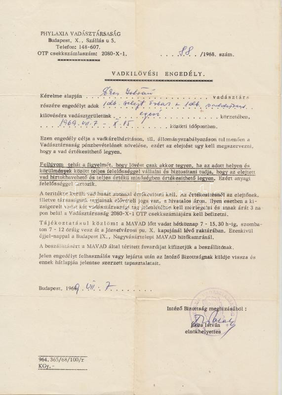 Leírás: 1969 Ékes István (?-?) vadászati író, a Phylaxia Vadásztársaság elnökhelyettese által saját maga részére kiállított vadkilövési engedély