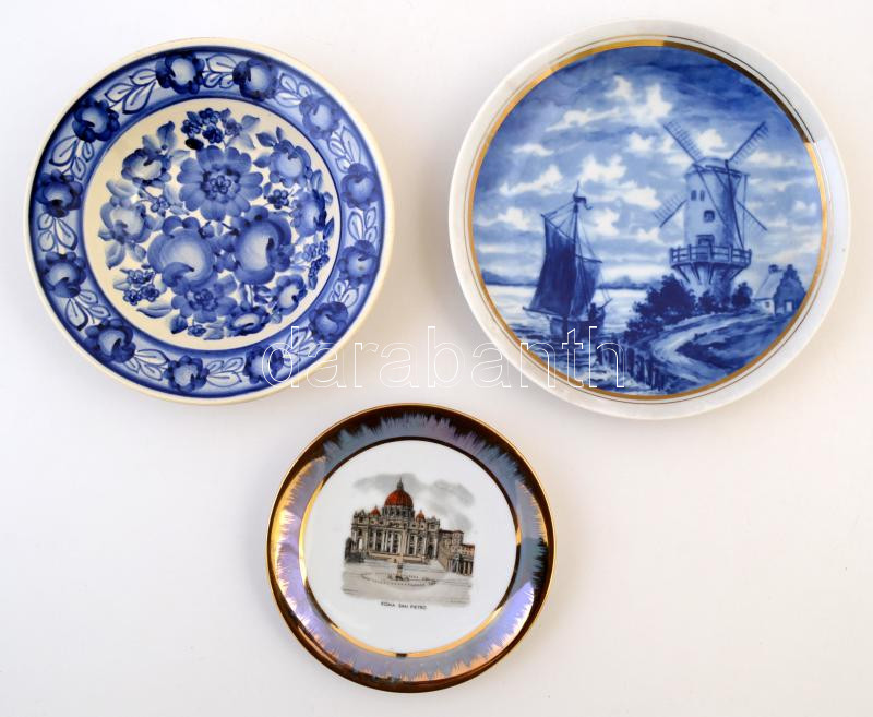 Leírás: 3 db porcelán és fajansz falitányér, kézzel festett, matricás, hibátlanok, jelzettek, 14, 17 és 20 cm