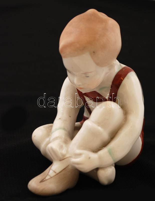 Leírás: Aquincumi cipőfűzőt kötő porcelán kisfiú, kézzel festett, jelzett, kopott, m: 11 cm