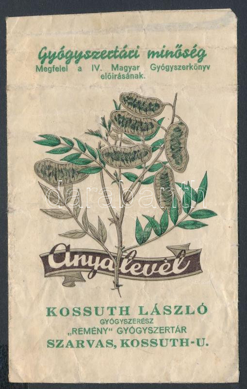 Leírás: cca 1910 Kossuth László szarvasi "Remény" gyógyszertára által forgalmazott anyalevél grafikus papírzacskója, kissé gyűrött, 13×8 cm