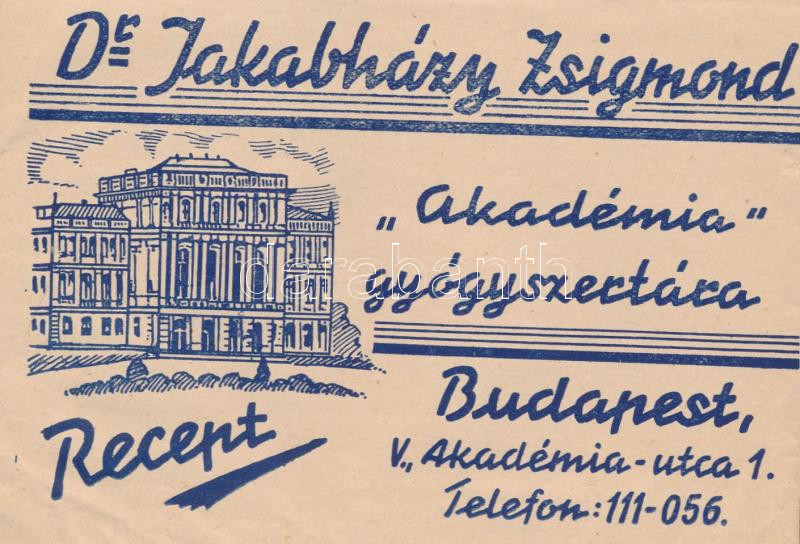 cca 1930 Dr. Jakabházy Zsigmond "Akadémia" gyógyszertára, Bu... https://www.darabanth.com/hu/285-Gyorsarveres/285.0/Festmeny-mutargy-papirregiseg-egyeb/Reklam~100020/cca-1930-Dr-Jakabhazy-Zsigmond-Akademia-gyogyszertara-Budapest-Akademia-utca-1-papir-rece~II1484050