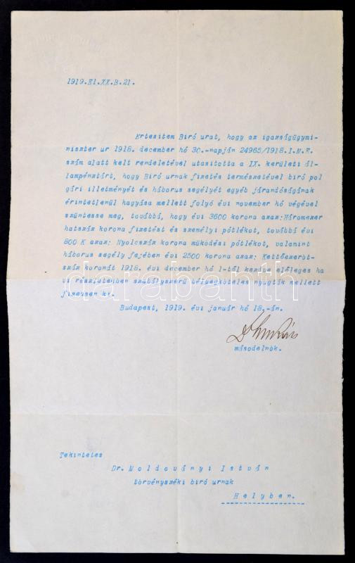 Leírás: 1919 A budapesti törvényszék másodelnökének gépelt, aláírt levele Moldován István törvényszéki bírónak bírói illetmény kifizetéséről