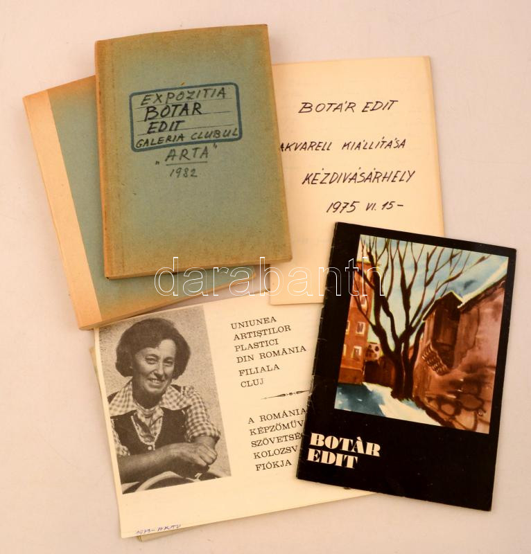 Leírás: Botár Edit (1930-2014) báb- és díszlettervező, textilművész két 70-es évekbeli kiállításának katalógusa, vendégkönyve és plakátja. Rajtuk aláírással.
