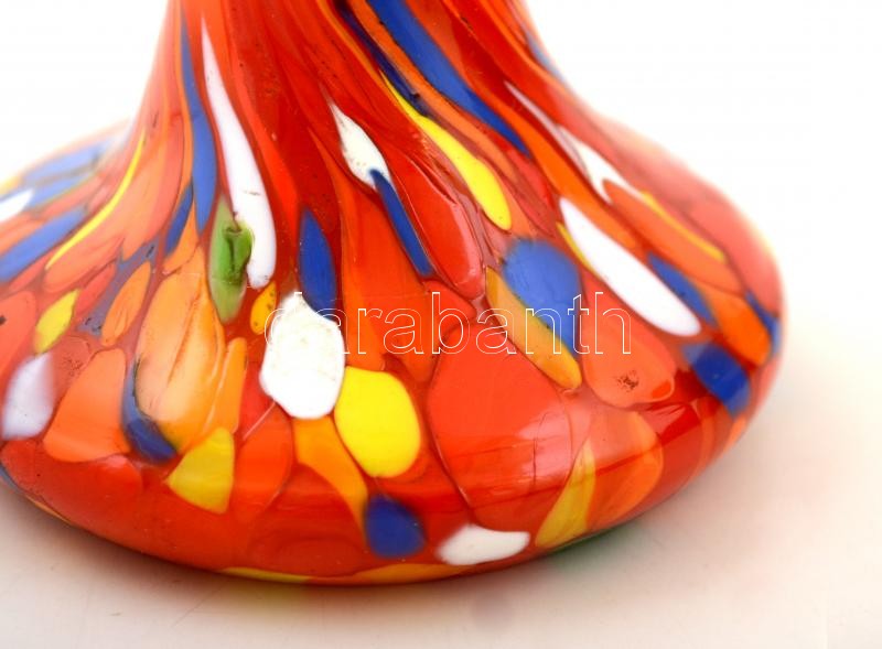 Leírás: Naracssárga üvegváza hullámos peremmel, anyagában színezett, peremén kis hibával, m: 15 cm
