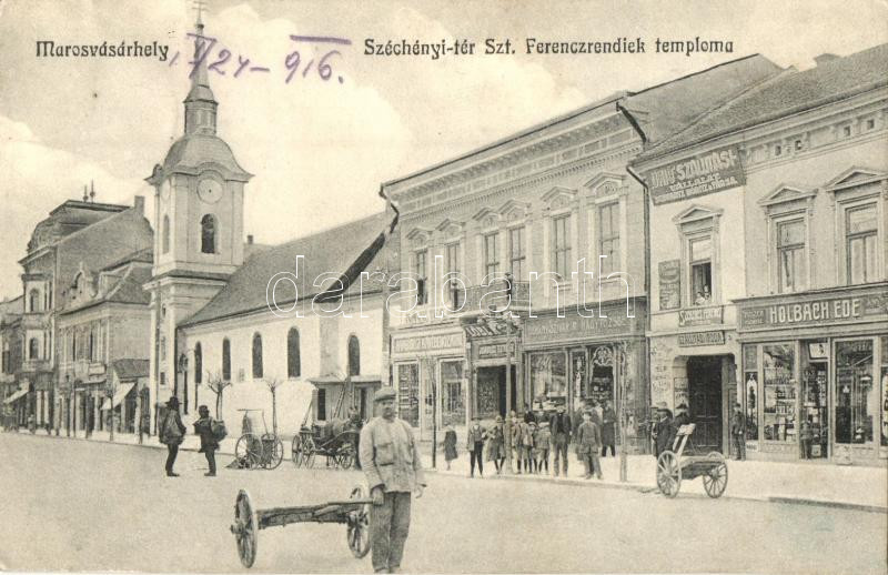 Marosvásárhely, Targu Mures; Széchényi tér, Szent Ferencrendiek temploma, Schwartz Móritz és Társa 'Unió' szállítási vállalata, Igánovics Testvérek, Löbl, Holbach Ede üzletei, dohánytőzsde, Hamburgi kávébehozatal, Porjes S. Sándor kiadása / square, church, shops, carriage company, tobacco shop, coffee import house (EK)