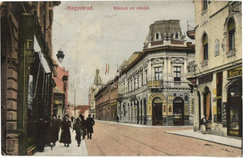 Nagyvárad, Oradea; Rákóczi út, belvárosi takarékpénztár, Tarsoly és Risztó, Wurst József üzletei, Sipos József kiadása / street, savings bank, shops (ázott sarok / wet corner)