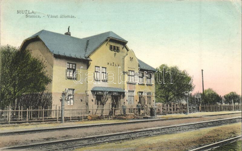Leírás: Muzsla, Muzla; Vasútállomás / stanica / railway station (EK)