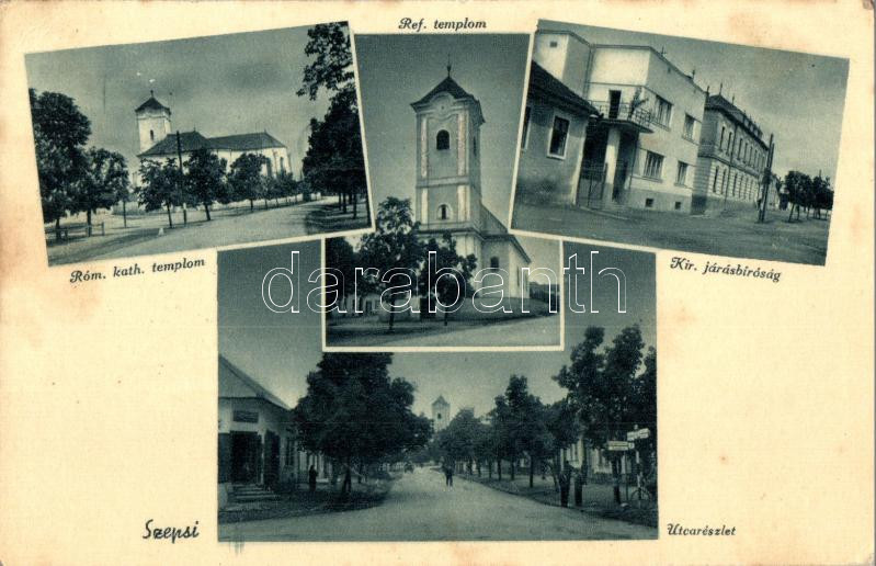 Szepsi, Moldava nad Bodvou; Római katolikus és református templomok, Kir. járásbíróság, utcarészlet, üzletek, Tóth István kiadása / churches, court, street, shops (EK)