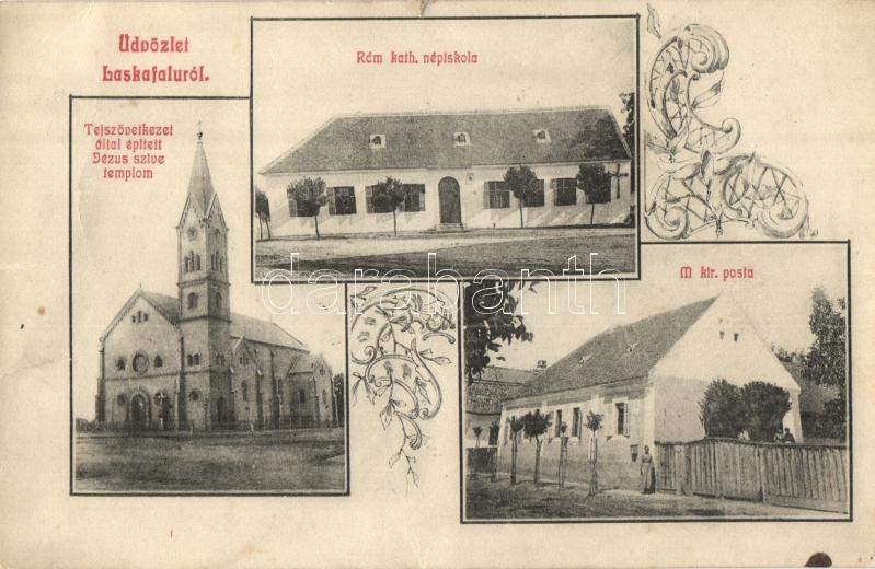 Leírás: Laskafalu, Ceminac; Jézus szíve templom, plébánialak, katolikus népiskola / catholic church, parsonage, school, Art Nouveau (r)