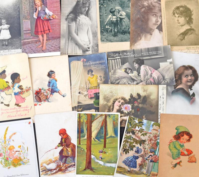 Leírás: 100 db RÉGI gyerek motívumlap, vegyes minőség / 100 pre-1945 children motive cards, mixed quality