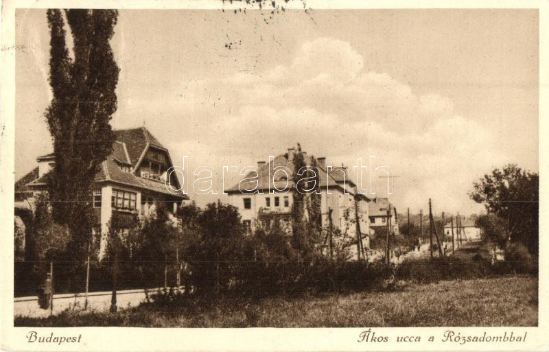 Budapest II. Rózsadomb, Ákos utca, villák, kiadja Kiss Albert (EK) https://www.darabanth.com/hu/285-Gyorsarveres/285.0/Kepeslapok/Magyarorszag~200005/Budapest-II-Rozsadomb-Akos-utca-villak-kiadja-Kiss-Albert-EK~II1485690