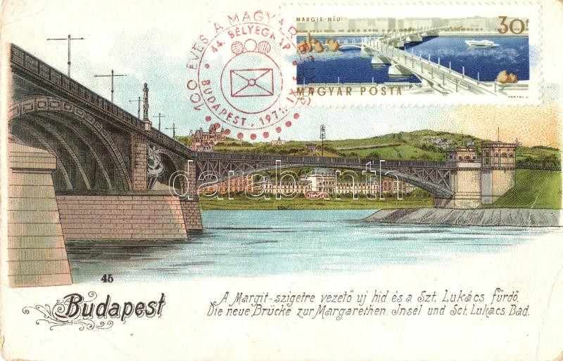 Leírás: Budapest XIII. Margitszigetre vezető új híd, Szent Lukács fürdő, litho '44. Bélyegnap Budapest 1971' So. Stpl. TCV card (EB)