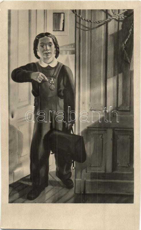 Leírás: 2 db MODERN éltanuló jelvényes képeslap a Rákosi korszakból / 2 modern student medals from the Rákosi-era
