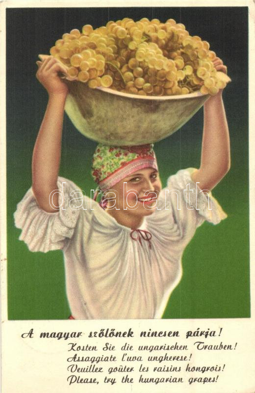 'A magyar szőlőnek nincsen párja', magyar szőlőreklám, folkl... https://www.darabanth.com/hu/285-Gyorsarveres/285.0/Kepeslapok/Reklam~200075/A-magyar-szolonek-nincsen-parja-magyar-szoloreklam-folklor-Klosz-Gyorgy-es-Fia-kiada~II1489372