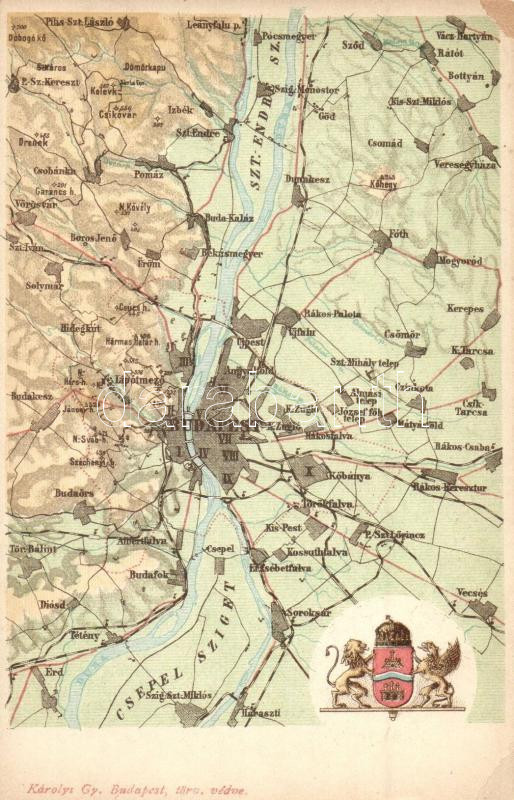 Budapest térképe címerrel, Károlyi Gy. / Map of Budapest with coat of ... https://www.darabanth.com/hu/285-Gyorsarveres/285.0/Kepeslapok/Terkep~200082/Budapest-terkepe-cimerrel-Karolyi-Gy-Map-of-Budapest-with-coat-of-arms-kopott-sarok-worn-~II1484526