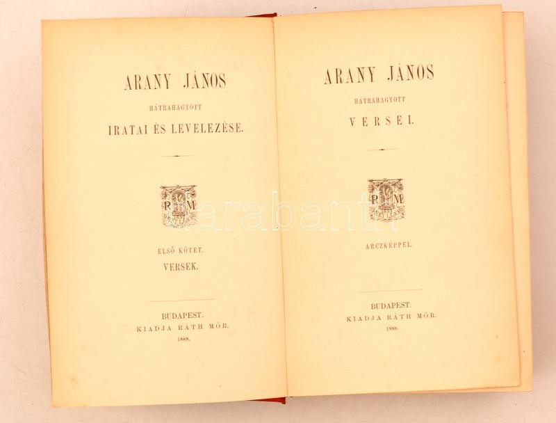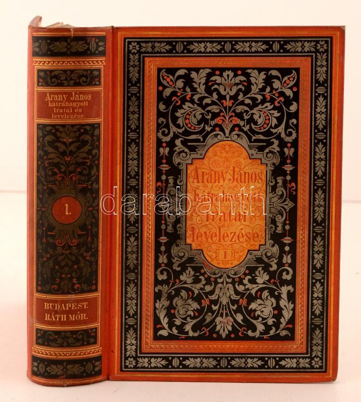 Arany János összes munkái 5. + Arany János hátrahagyott iratai és levelezése 1-4. Budapest, 1884-1889, Ráth Mór. Kiadói egységes festett, aranyozott egészvászon kötés, márványozott lapélekkel, szép állapotban. Arany János összes munkái 5. Arany János Prózai dolgozatai. Budapest, 1884, Ráth Mór, 548 p. Második kiadás. A borítón minimális kopás, háta foltos. Arany János hátrahagyott iratai és levelezése 1. Versek. Budapest, 1888, Ráth Mór, 1 t+LI+556 p. Arany János hátrahagyott iratai és levelezése 2. Prózai dolgozatok. Budapest, 1889, Ráth Mór, 1 t+575+XLIII p.+2 t. Arany János hátrahagyott iratai és levelezése 3. Levelezés I. Budapest, 1888, Ráth Mór, 1 t+XIX+494 p.+2 t. Arany János hátrahagyott iratai és levelezése 4. Levelezés II. Budapest, 1889, Ráth Mór, 1 t.+474 p.+1 t. A kötése a 464/465 p. között sérült.
