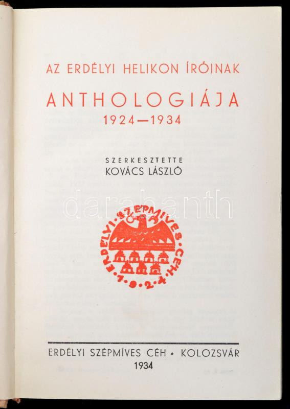 Az Erdélyi Helikon íróinak anthologiája 1924-1934. Szerk.: Kovács László. Kolozsvár, 1934, Erdélyi Szépmíves Céh. Kicsit kopott vászonkötésben, egyébként jó állapotban.
