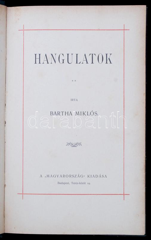 Bartha Miklós: Hangulatok. Bp., 1898, Magyarország. VII +150 p. Első k... https://www.darabanth.com/hu/285-Gyorsarveres/285.0/Konyvek/Konyvek-Egyeb-ritkasagok~100042/Bartha-Miklos-Hangulatok-Bp-1898-Magyarorszag-VII-plus150-p-Elso-kiadas-Korabeli-kopottas-f~II1281119