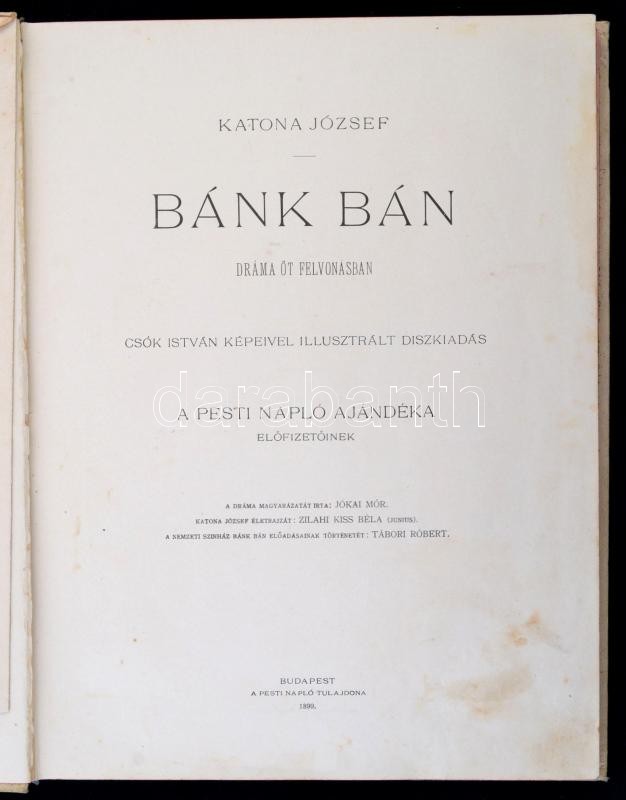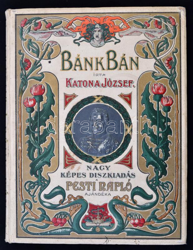 Katona József: Bánk bán. Dráma öt felvonásban. Csók István képeivel illusztrált díszkiadás. A Pesti Napló ajándéka előfizetőinek. Budapest, 1899, Pesti Napló, LXXXIII+167 p. Kiadói aranyozott, festett egészvászon kötés, festett lapélekkel, kissé kopottas borítóval, a címkép kijár és sérült.