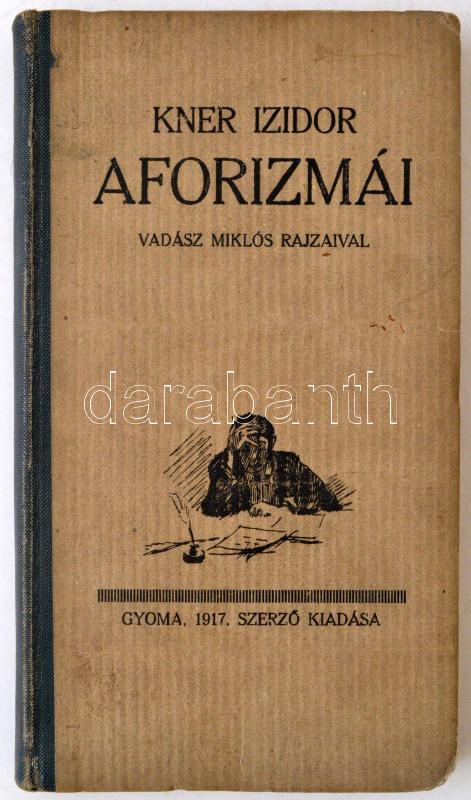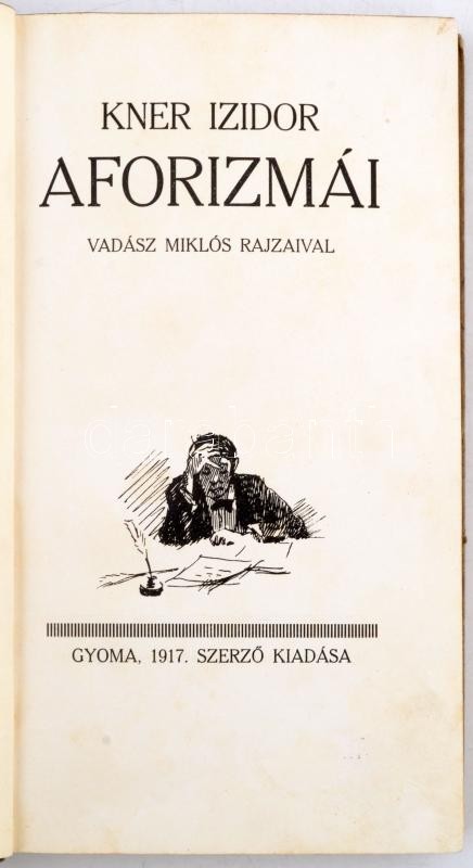 Kner Izidor: Aforizmái. Vadász Miklós rajzaival. Gyoma, 1917. Szerző k... https://www.darabanth.com/hu/285-Gyorsarveres/285.0/Konyvek/Konyvek-Egyeb-ritkasagok~100042/Kner-Izidor-Aforizmai-Vadasz-Miklos-rajzaival-Gyoma-1917-Szerzo-kiadasa-1-t-KI-arcke~II1392647