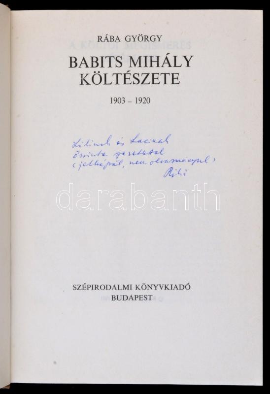 Rába György: Babits Mihály költészete 1903-1920. Bp., 1981, Szépirodalmi Könyvkiadó. A szerző dedikációjával. Vászonkötésben, papír védőborítóval, jó állapotban.