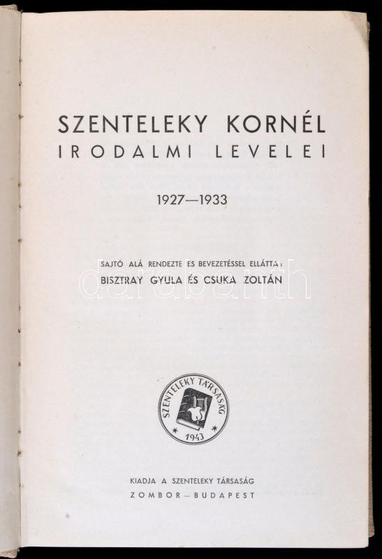 Szenteleky Kornél irodalmi levelei 1927-1933. S. a. r.: Bisztray Gyula - Csuka Zoltán. Zombor - Budapest, 1943, Szenteleky Társaság. A Szenteleky Társaság ex librisével. Vászonkötésben, jó állapotban.