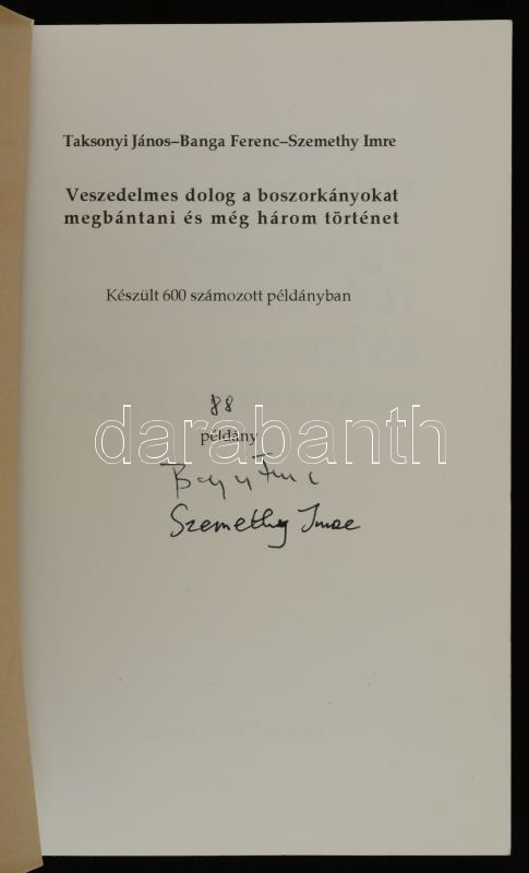 Taksonyi János - Banga Ferenc - Szemethy Imre: Veszedelmes dolog a boszorkányokat megbántani és még három történet. Bp., 1996, Képes Próza Tár. 88. számú sorszámozott példány, készült 600 számozott példányban. Banga Ferenc és Szemethy Imre aláírásával. Papírkötésben, jó állapotban.