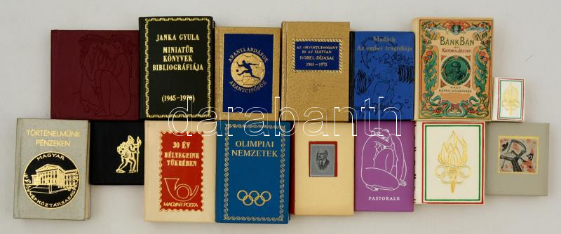 15 db Minikönyv, ebből 7 db számozott (Bródy László: Vitéz László alkonya, 30 év bélyegeink tükrében, Janka Gyula: Miniatűr könyvek bibliográfiája (1945-1970), Olimpiai Nemzetek, Olimpiai Győzteseink, Az orvostudomány és az élettan Nobel-díjasai 1901-1975, Olimpiai Győzteseink), valamint 8 db számozatlan kiadás (Nyomdajegyek, Lenin, Aranylabdások, Aranycipősök, Madách: Az ember tragédiája, Történelmünk pénzeken, Bánk Bán Nagy Képes Díszkiadás hasonmás kiadása, Reich Károly: Pastorale, Reich Károly: Variációk), jó állapotban.