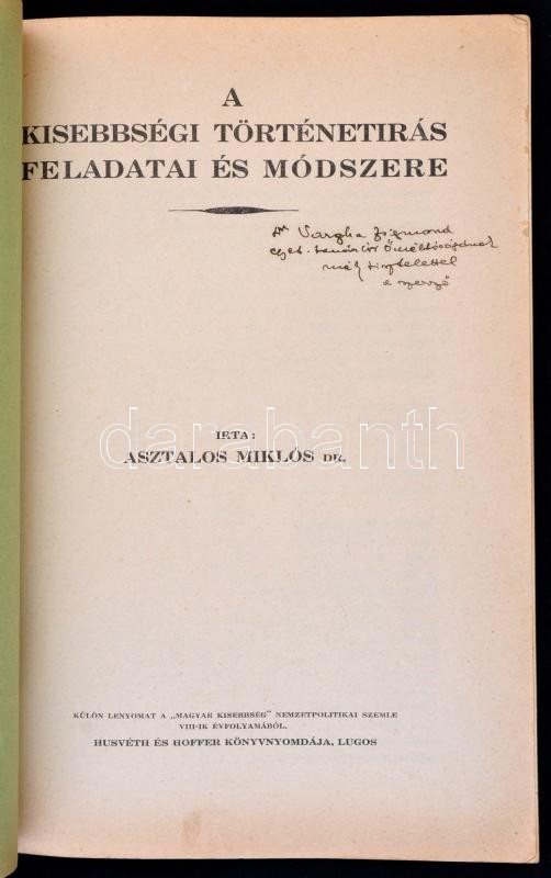 Asztalos Miklós: A kisebbségi történetírás feladatai és módszere. Klny. a Kisebbség 8. évfolyamából. Lugos, 1929, Husvéth és Hoffer. A szerző által dedikált példány. Tűzött papírkötésben, jó állapotban.