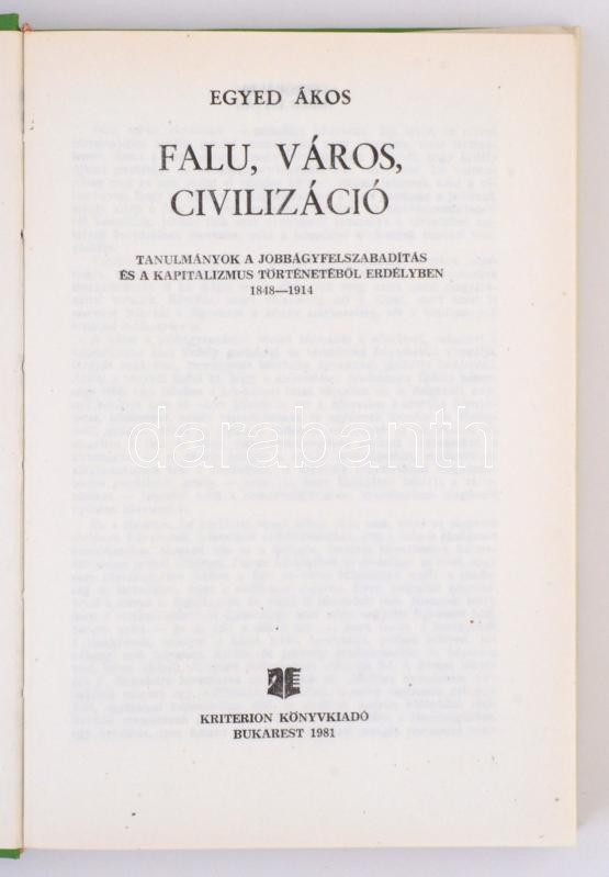 Egyed Ákos: Falu, város, civilizáció. Tanulmányok a jobbágyfelszabadítás és a kapitalizmus történetéből Erdélyben 1848-1914. Bukarest, 1981, Kriterion. Kiadói kemény papírkötés, kiadó kissé szakadt papír védőborítóban. Jó állapotban.