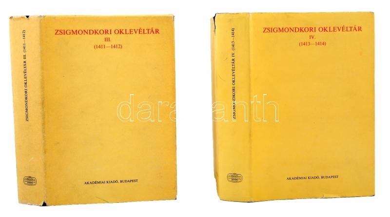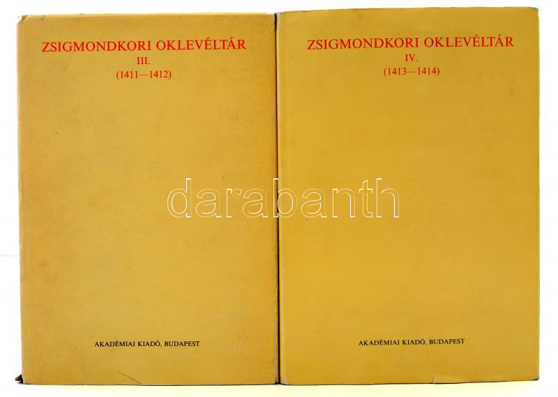 Leírás: Mályusz Elemér, Borsa Iván: Zsigmondkori Oklevéltár III-IV. (1411-14) Magyar Országos Levéltár Kiadványai II. Forráskiadványok 22., 25. Bp., 1993, Akadémiai Kiadó. Kiadói egészvászon kötés, kiadói papírborítóban. Jó állapotban.