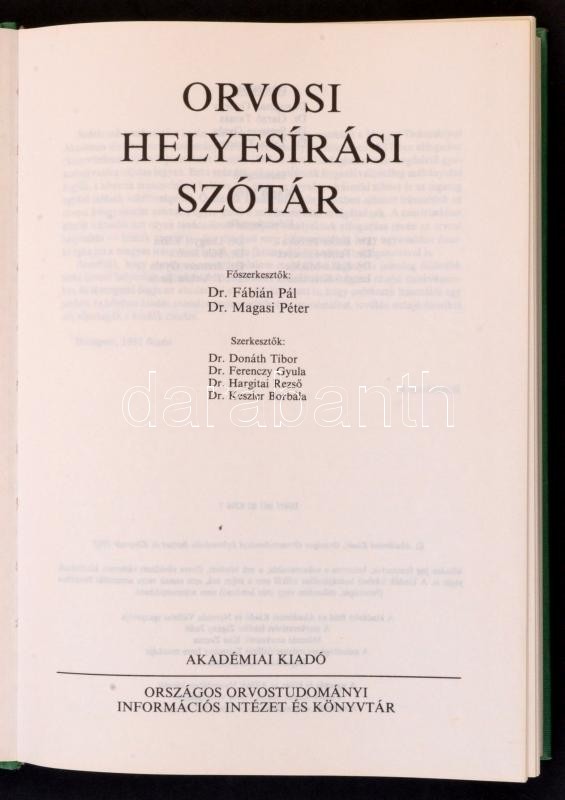 Orvosi helyesírási szótár. Szerk.: Dr. Fábián Pál, Dr. Magasi Péter. Bp., 1992, Akadémiai Kiadó-Országos Orvostudományi Információs Intézet és Könyvtár. Kiadói egészvászon kötés, jó állapotban.
