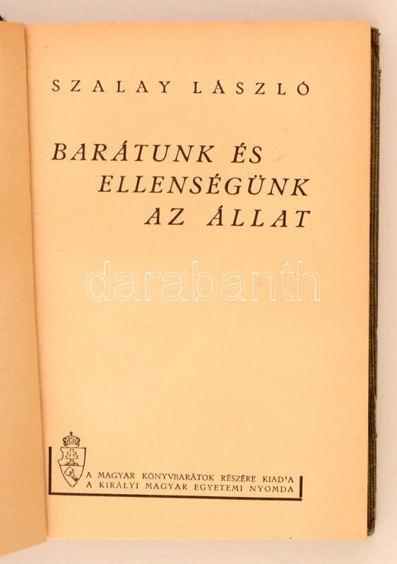 Szalay László: Barátunk és ellenségünk az állat. Budapest, 1943, Királyi Magyar Egyetemi Nyomda. Kiadói aranyozott gerincű félvászon kötés, fekete-fehér fotókkal illusztrálva. Jó állapotban.
