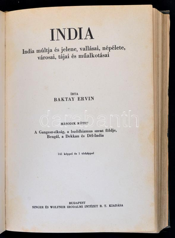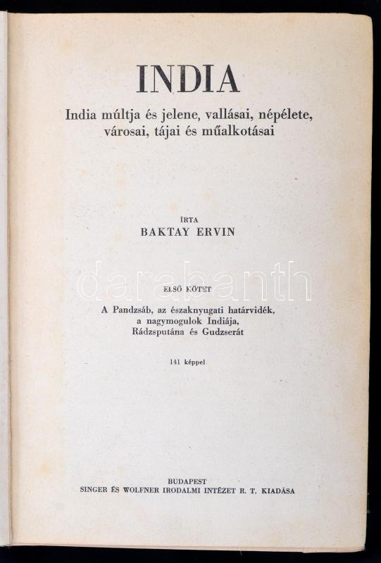 Baktay Ervin: India. India múltja és jelene, vallásai, népélete, városai, tájai és műalkotásai. Budapest, é.n. (1931), Singer és Wolfner Irodalmi Intézet Rt. Kiadói kopottas egészvászon kötés, kissé laza fűzéssel.