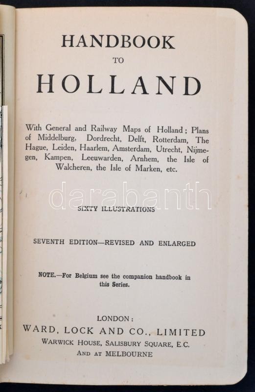 Handbook to Holland. Tourist Handbooks. London, é.n, Ward, Lock & Co. Hetedik, átdolgozott és bővített kiadás. Kiadói egészvászon kötés, térképekkel, és fekete-fehér képekkel illusztrálva, angol nyelven./
