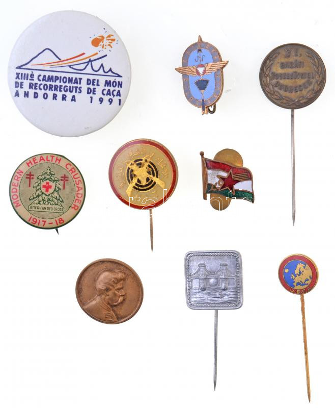 9db-os vegyes magyar és külföldi jelvény és kitűző tétel, közte Amerikai Egyesült Államok 1918. "Amerikai Vöröskereszt - Modern egészségügyi kereszteslovag" műanyag jelvény (22mm) T:2