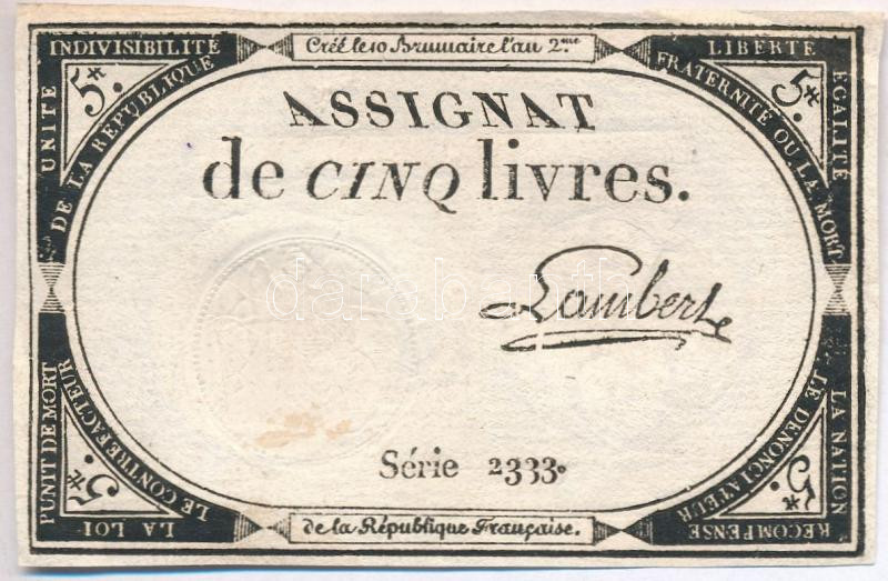 France 1793. 5 Liv... https://www.darabanth.com/hu/285-Gyorsarveres/285.0/Numizmatika/Kulfoldi-bankjegyek~300011/Franciaorszag-1793-5L-Assignata-TIII--France-1793-5-Livres-Assignat-CF~II1484656